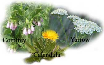 The three most often recommended "must have" healing herbs are Comfrey, Yarrow, and Calandula. These three are quite powerful for healing anything, and I've heard of one lady who keeps a bottle handy with handfulls of these three set in olive oil; which she uses as a first aid salve on any cuts, abrasions or lacerations any of her animals, (or humans!) get.