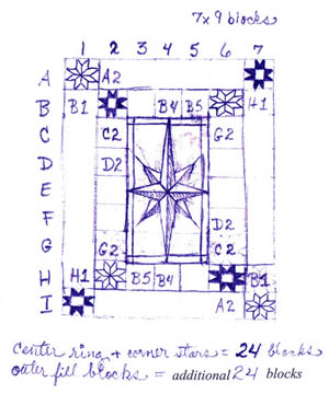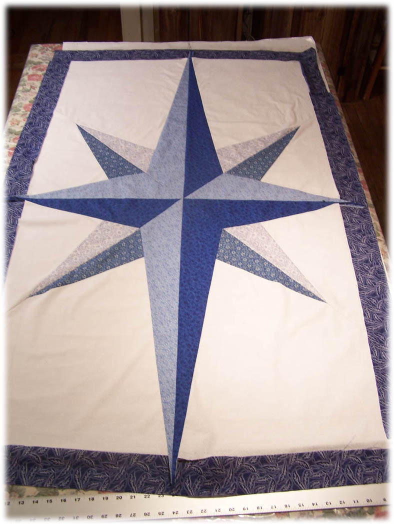 But it all started back in July/August. After sending out the call for blocks Abi and I hurriedly got started on ours... and this was the projected idea: below. (We later changed the border color, which turned out better.) Anyway, since it didn't have the required 'sixteen-or-up' points for a Mariner's Compass; we called it the 'Compass Star' and called it good. |