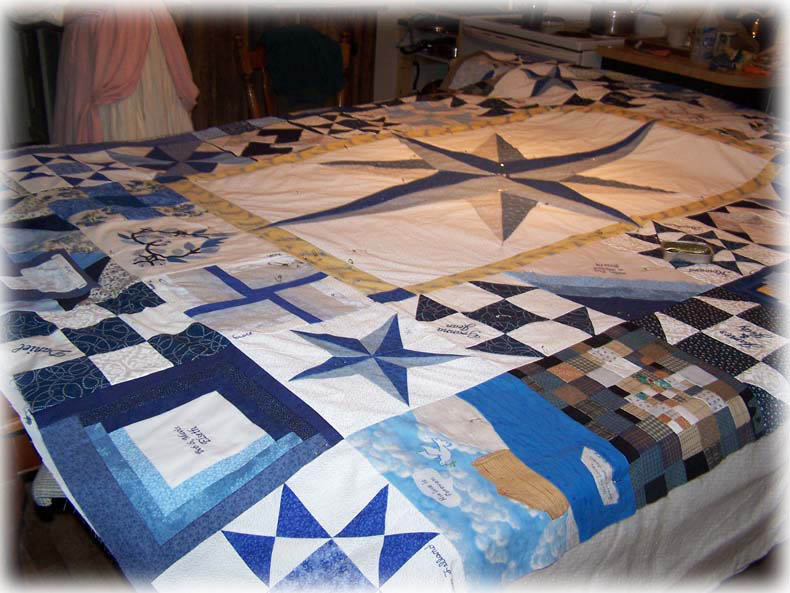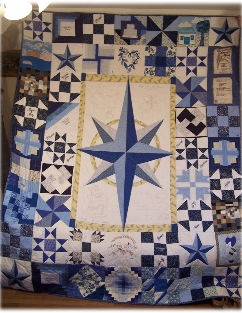 We'll be making a medallion piece for the center; a version of the Mariner's Compass. 12" blocks will line this all around, with the corner blocks being Ohio Stars, and Lone Stars, representing the couple's home states. (See above.) We're hoping to be able to co-ordinate the remaining blocks in sort of a mirror effect, a similar one set in opposite sides of the 'ring' to bring the design together.