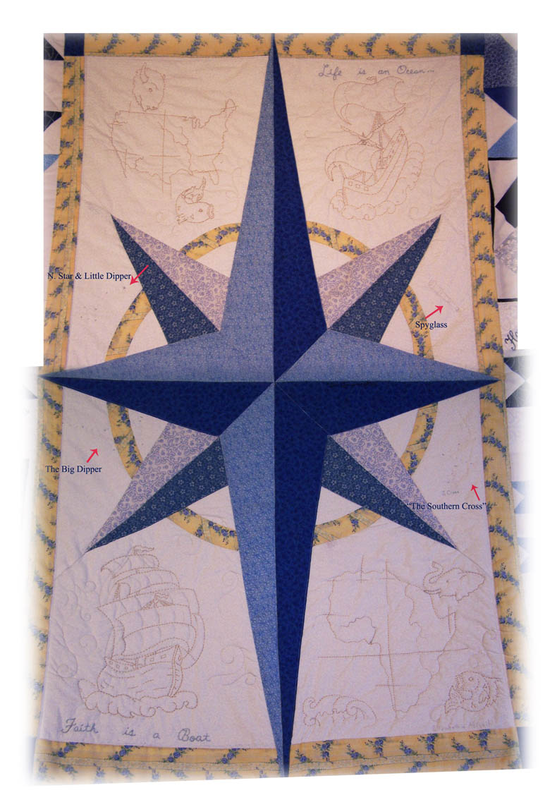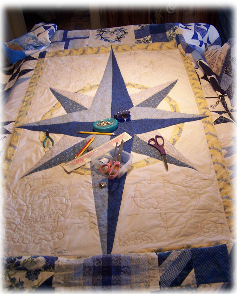 So, we got the middle part quilted in, and then we appliqued a yellow circle behind the star. I really thought it neeed that circle to make it look more 'compass-y'. |