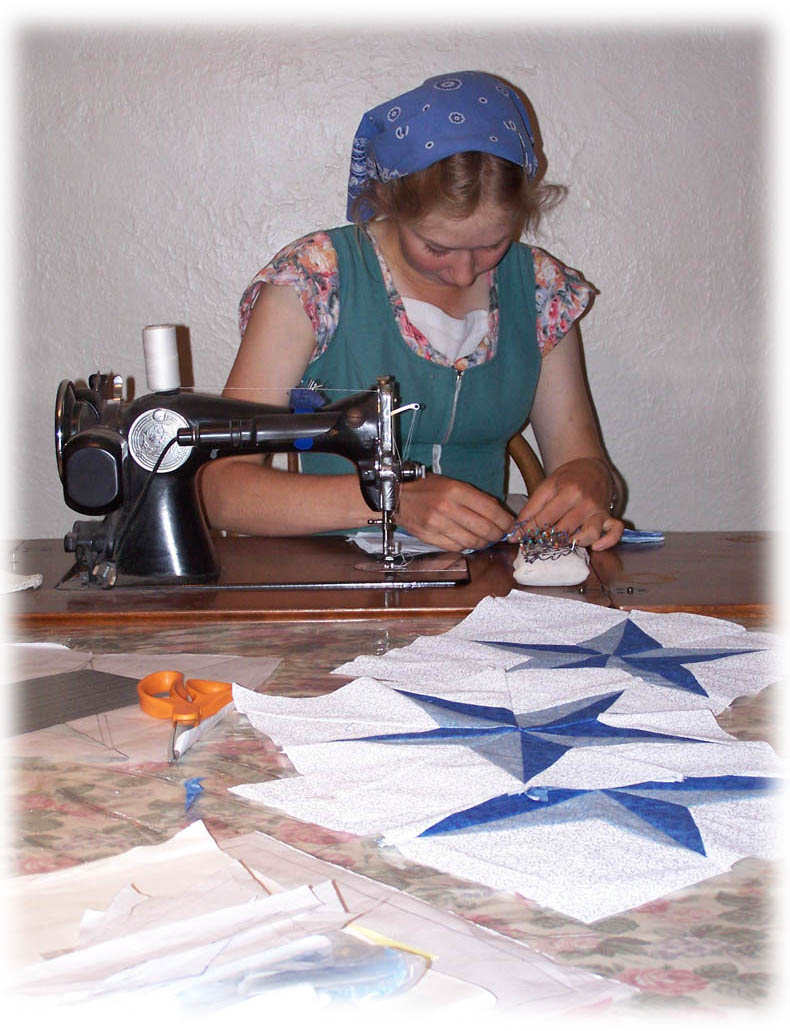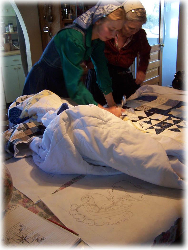 After this step I knew I needed to be coming up with the designs for the center, so I started on them while Abi and Mom began quilting the block-to-block areas with the Singer. I left that part to them, and they did a great job! |