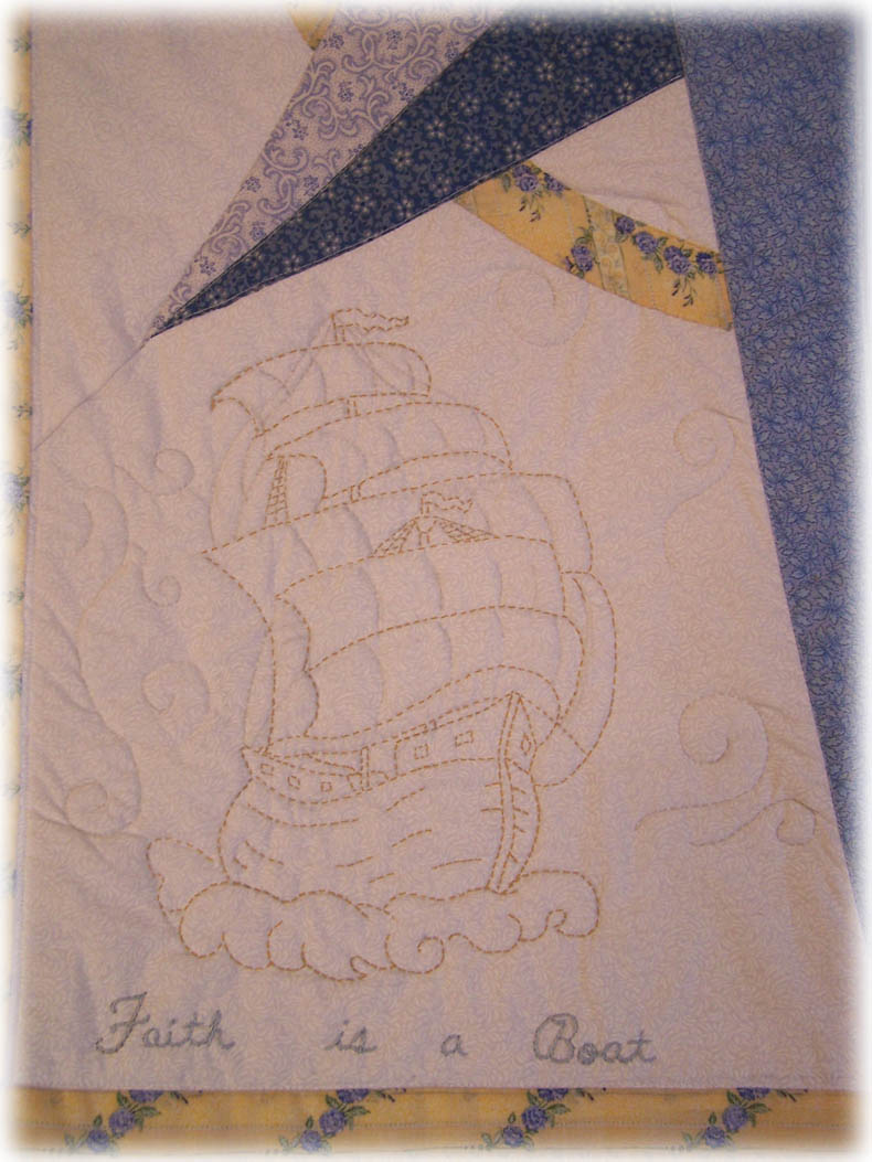 I liked 'Faith' in place of 'Love', and we embroidered the first sentence in two parts along with the ships. |