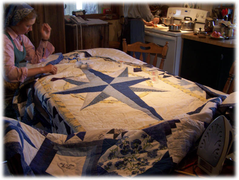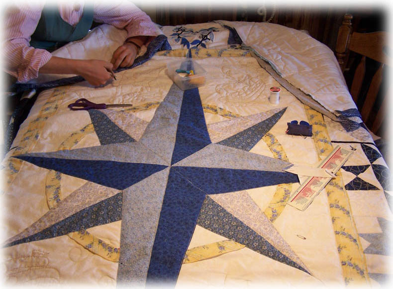 Secondly, I'm finally getting these pictures up where you all can see the finished product. Several of you have already seen it in person when Katie and Amos were visiting family in October. But those of you who didn't... here are the pics I took. Wish they were better, but the weather did not cooperate at the crucial moment... the few days we had between "Finish" and mailing were dull, gray ones. So we had to use indoor lights. (But those days did give us some nice handquilting hours; Below.)