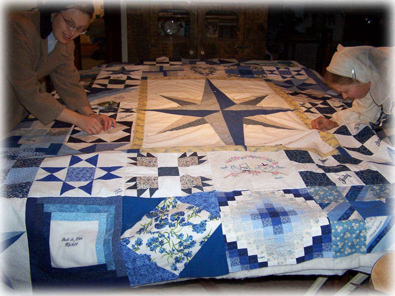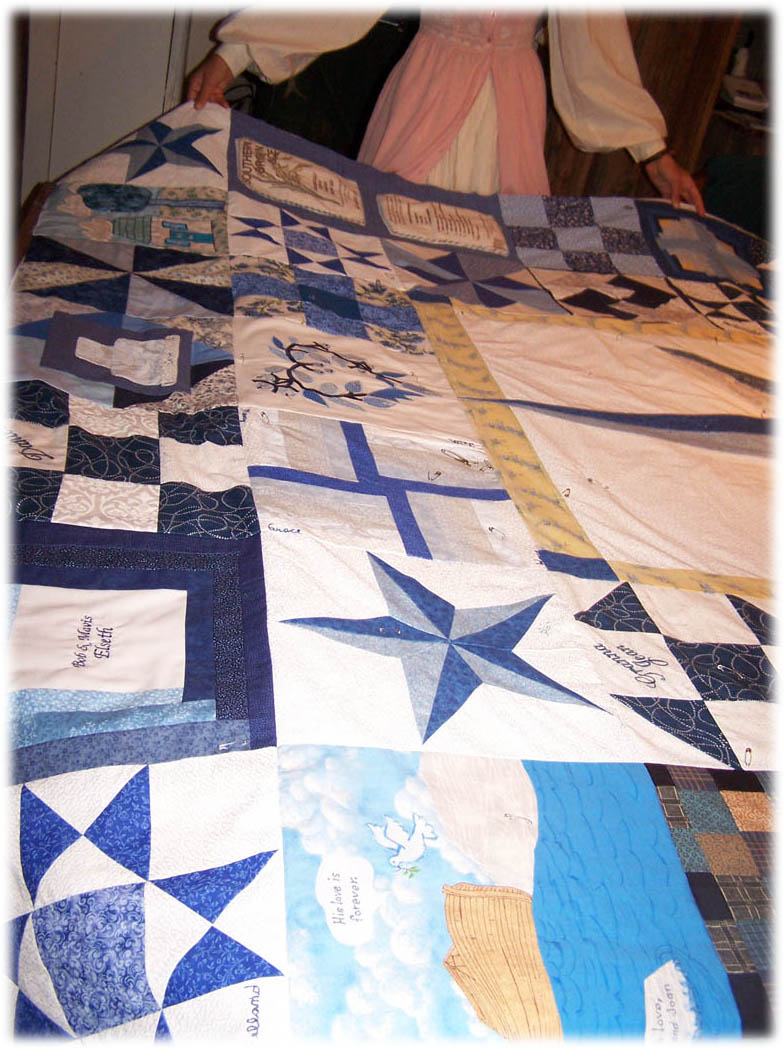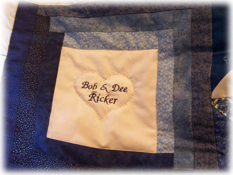 Machine quilting with the Singer enabled us to be fast enough to get it done by our deadline, but we did add little touches of hand quilting here and there where it worked best with the pattern of the block. Here we put a heart to hold the wide middle of this block from the Minnesota branch of the Elseths. |