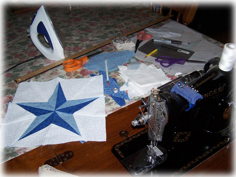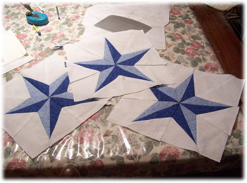 We were shooting for 4 Ohio Stars and 4 Texas Stars for the corners, representing the couple's "home states". The Felland ladies graciously agreed to take on the Ohio Star blocks, so that left us with the Texas Stars to wrangle up. Because we thought the available 'Texas Star'-type patterns didn't look as much like a true Texas Star as we'd like, we drafted a pattern we liked better. (This turned out to have its own little difficulties, but we got'er done.)
