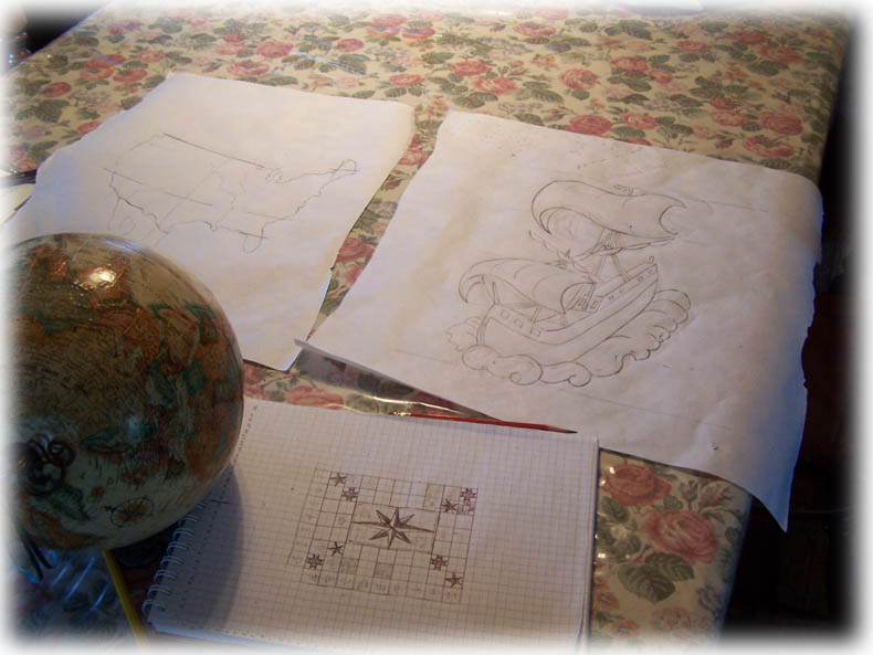 Since we were trying to go for a thematic/symbolic feel with the whole, we decided to put North America, (where Amos was born, naturally!) on the upper left corner, and Africa, (where Katie was born!) on the lower right. Sort of ancient-mariner-map like. Going with this theme, it seemed appropriate that the upper-right and lower-left have sailing ships, (representing several things, whichever way the viewer wants to see it; as in a life-journey, as in keeping your heading by the compass, etc.) but mostly, to me, as a paraphrase of a song by the Boatwrights... "Life is an ocean, Love is a boat. In troubled waters, It keeps us afloat."
