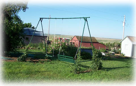 An old rusted swing-set frame and a metal porch swing without a home, both got a coat of rustoleum, and joined together to provide a fine place to rest in the evening... with a nice view!